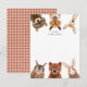 Söta barns brevpapper kort med handritad illustration av skogs djur (tvättbjörn, räv, hjort, uggla, björn och en kanin).