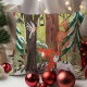 Söta skogsdjur i en grön julskog, med en hjort, ren, två små rävar, fåglar, uggla och en grävling. Växterna har bär på sina blad och det växer svamp, marken är snötäckt och solen skiner genom grenarna, träd från skogen . Originalkonst av Caroline Bonne Müller