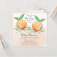 Två söta små persikor är på gång med en inbjudan till babydusch med vackra små persikor och grönt löv på vattenfärgen tvättar persikobakgrunden med utspridd guld-konfetti. Besök vår butik för att visa vår söta lilla persiko-designsamling.