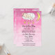 En söt liten vit babyflicka som sover på en moln omgiven av hjärtan och stjärnor, rosa bakgrund baby shower inbjudan.