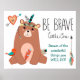 Här är en bedårande barnkammarsaffisch med ett färgglatt tema och ett positivt budskap! Den visar en söt brun björn iförd hövdingdräkt, pärlor och fjädrar. Han håller en orange och blå bohemsk fjäder, och en orange och turkos fågel sitter på hans ben. Bredvid honom finns en hjärtformad bild med en pil genom. Texten högst upp i svart säger "Var modig lilla en", och nedanför i turkos, "Dröm om de underbara saker du KOMMER ATT GÖRA!" Den nedre delen av texten kan anpassas. Vid den högra kanten finns en uppåtriktad pil med en bohemsk fjäder i turkos, guld och rosa.