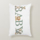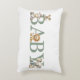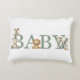 Denna anpassade barnkudde har ett salvia grönt, könsneutralt tema med illustrationer av söta små stoppade djur. Ordet "BEBIS" är tryckt med versaler tvärs över den övre delen. Djur stoppade djur accentuerar bokstaven. En ko stoppad och mus är placerad till vänster, med ett lejonunge i mitten. En baby elefant och anka är placerade till höger.