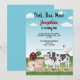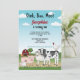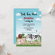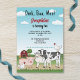 Desteis ursprungliga tecknade illustration av söta gårdsdjur inklusive en svart-vit ko, en rosa gris, ett får och två hönor. På baksidan finns en röd lada på grön gräsrik kulle tillsammans med ett träd och lite hö. Himmelen är blå med några moln. En av hönorna är placerad ovanpå kon. Anpassa provtextområdena med detaljerna för din fest.