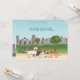 Desteis ursprungliga tecknade illustration av söta tecknade hundar i en park på en mulen dag. Det finns en blenheim Cavalier King Charles Spaniel, en apricotfärgad miniature Goldendoodle, en fawn fransk bulldog, en engelsk krämfärgad Labrador Retriever och en svart och tan släthårig Dachshund. Parken inkluderar en träbänk, en vintageinspirerad lyktstolpe, en stadssilhuett i bakgrunden och några gröna gräskullar. Framför hundarna ligger även en liten tennisboll. Anpassa textområdena med detaljerna från ditt evenemang.
