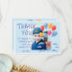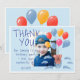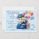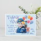 Söta Teddybjörnballonger Barnkalas Foto Tackkort. Söt teckning av en teddybjörn med färgglada ballonger och moln på blå bakgrund. Fotot är bakom teckningen och texten. Lägg till ditt foto, text och namn.