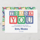 Åh pojken, åh pojken! Kommer du ihåg de klassiska trä-ABC-klossarna du brukade leka med? Den här designen föddes under en nostalgisk resa nerför minnesgatan, då jag mindes glädjen av att bygga torn och lära sig alfabetet, allt i de där starka, primära färgerna! Vi fångade den söta, vintageaktiga leksakslådans charm för att stava ut ett stort, lekfullt "TACK". Det är perfekt för att skicka ett varmt, personligt meddelande efter en födelsedagsfest, en baby shower eller någon barnvänlig fest. Anpassa bara det lilla meddelandet och signaturen för att göra det till ditt eget. Det är inte bara ett tack; det är en liten, färgglad bit barndomsglädje!