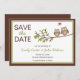 Whimsical save the date inbjudningskort med två söta ugglor som sitter på en gren med ett hjärta i en pratbubbla ovanför dem. Brun och grön kant på vit bakgrund. Personlig anpassning med din information i det tillgängliga utrymmet. Skaffa de matchande Owl Save the Date stemplarna nedan: