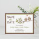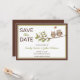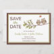 Whimsical save the date inbjudningskort med två söta ugglor som sitter på en gren med ett hjärta i en pratbubbla ovanför dem. Brun och grön kant på en vit bakgrund. Personlig anpassning med din information i det angivna utrymmet. Skaffa de matchande Owl Save the Date stämplarna nedan: