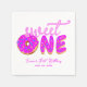 Bokstäverna i ETT är täckta med rosa glasyr och färgglada sprinkles. O:et är en rosa munk. Ovanför det står ordet "söt" skrivet med rosa handstilsstil. Under allt detta står tillfället skrivet med samma stilsnitt, men litet och rosa, med datumet i rosa versaler under.