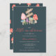 Vår lilla svamp är på väg! Söta små svampar av typen Frälssvampar, babyduschinbjudan med söt och söta svampar, i rött, rosa, blått, lila och rosa och en träskylt som säger babydusch på mörk blått. Perfekt babyduscha inbjudan för hösten firande med ett mejeritema eller ett trätema.