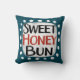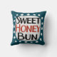En söt typografisk matdesign som säger "Sweet honey Bun". Det är svart och röd text på en rektangel med funky, lekfulla vita prickar runt den, allt på en tealbakgrund.