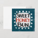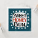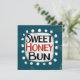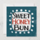 En söt typografisk matdesign som säger "Sweet honey Bun". Det är svart och röd text på en vit rektangel med funky, lekfulla vita prickar runt den, allt på en tealbakgrund.