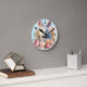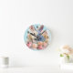 En klocka med en akvarellbild. En vit grå kanin omgiven av en krans av rosa och persikorosa rosor. För kaninälskare och påsktema och födelsedagar och shower.
