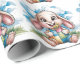En vattenfärgsillustration av en kanin i baby med ett lapptäcke. Kaninen har diskett öron och har en gult nappar i munnen. Kaninen ler och har ett sött uttryck. Bakgrunden är vit med blå himmel.
