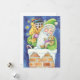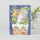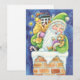 Vintageillustration God jul semesterdesign med en söt, glad tomte på taket av ett hus. Han bär en säck med leksaker, godis och en teddybjörn som klättrar nerför en snötäckt skorsten på natten med stjärnor på himlen på julafton. Ho, ho, ho, God Jul och trevliga högtider!