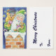 Vintageillustration God jul-helgdesign med en söt, glad tomte på taket av ett hus. Han bär en säck med leksaker, godis och en teddybjörn när han klättrar nerför en snötäckt skorsten på julaftonskvällen med stjärnor på himlen. Ho, ho, ho, God Jul och trevliga högtider!