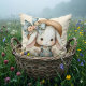 Denna fantasifulla design har en oemotståligt söt vit kanin iklädd charmiga denim-overaller, prydda med pastellfärgade tygfläckar och matchade med en skrynklig blus. Kaninens stora halmhatt, detaljerad med ett drömskt blått band och en delikat klunga handritade blommor, tillför en vintage cottagecore-känsla. Mjuka, måleriska texturer och varma, dämpade färger förstärker den övergripande mysiga och nostalgiska estetiken, perfekt för dem som älskar söta, saga-inspirerade bilder. De uttrycksfulla ögonen och den milda rodnaden ger kaninen en hjärtlig personlighet, vilket gör den till ett vackert tillägg till barnkammarteman, vårdekorationer eller säsongsbetonade presenter. AI-genererad konst