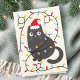 Julhälsningskort med en söt katt med röd tomteluva och julgransbelysning. Text inuti “Önskar dig en perfekt jul” i ett modernt script-teckensnitt.