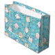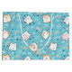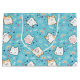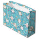 En stor presentpåse med ett sött kattmönster, placerad på en blå bakgrund och dekorerad med regnbågar och tassavtryck med mera.