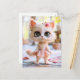 Söt illustration av ett litet kattungedunge som bär en rosa klänning, står i ett mysigt rum. Perfekt för barnteman, dekorativa projekt och lekfulla designer.
