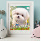 Sött maltesiskt vitt valpdjur i blomsterträdgårdsk poster
