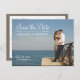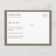 Elegantens typografi och den enkla formateringen av det här fotovykortet innehåller förlovningens foto och informationen "Spara datum" i vit text på framsidan på lämnat sida. Mjuk neutralt grått/brunt färg på baksidan med plats för alla viktiga uppgifter: bröllop datum, webbplats och ett personligt meddelande. Perfekt för en offert porträtt.