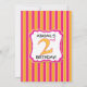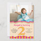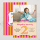 Denna flickas andra födelsedagsfest inbjudan har ljusa rosa och orangea vertikala ränder och en stor orange prickig siffra 2 som ger en mycket söt touch till denna födelsedags inbjudan. Anpassa med ditt favoritfoto av födelsedagsflickan! Fotografi © Storytree Studios, Stanford, CA