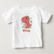 Denna personliga barn-t-shirt har en söt röd babydinosaurie med stora ögon och en vänlig leende, som står glatt omgiven av blommor och fjärilar.