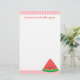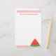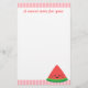 En söt teckning av en skiva vattenmelon med frön som fräknar. Vattenmelonen ler glatt. Texten lyder "En söt hälsning till dig". En förtjusande fruktig design som är perfekt för flickor att skriva sina små söta meddelanden till någon speciell. Rosa ränder som bakgrund.