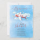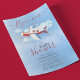 En inbjudan till babydusch i ett flygplan med en inbjudningsmall som är lätt att anpassa.Med en bakgrund i blå himmel, ett rött, vitt och blått flygplan, moln, stjärnor och text som lyder "flyga över" i ett typsnitt. Alla teckensnitt, stilar och färger i bakgrunden kan ändras genom att klicka på den anpassade länken efter anpassning.
