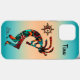 Anpassa det här unika "One of a Kind"-telefonväskan Kokopelli Cell-telefonväskan! Det finns en Kokopelli som spelar ut flöjten och dansar under Sol på en turkos och Orange-solnedgång. Original Graphic Art Design skapas av konstnären Kerry Miller.