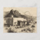 This monochrome sketch depicts a tranquil southwestern desert scene featuring an adobe-style home nestled against rocky mountains.