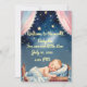 Välkommen din babypojke med denna fredliga och drömlika inbjudan! Med en sovande nyfödd som vilar under en mjuk stjärnklar natt, inramad med ömma gardiner och en mysig vagga. Perfekt för baby shower, födelsetal eller välkomstfester. Helt anpassningsbar med din babys detaljer.