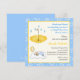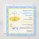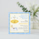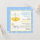 Sovande babypojke stänkblå fyrkantig inbjudan med en sovande babypojke på en moln, en halvmåne och en stjärna ovanför och en gul paraply med vattendroppar. Det finns en gul linje runt det och en blå kant med vita cirklar och prickar. En söt inbjudan med en bedårande baby perfekt för en babys stänk eller shower. Vissa element av Trina Clark och med tillstånd av vectorportal.com.