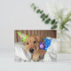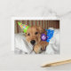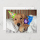 Har du någonsin varit trött efter en lång dag med att fira din födelsedag? Detta vykort har ett fotografi av en söt golden retriever hund inklämd i sängen, iförd pyjamas och en festhatt och håller på sin teddybjörn. Dags att sova!