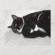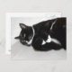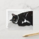 Postkort med söt, lat svart-vit katt i smoking som ligger på ett bord