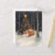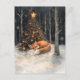 Postkortskonst med en bedårande sovande räv framför en julgran i skogen.
