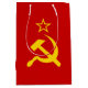 Gult hammare och skärpa på röd flagga. Sovjetunionens historiska flagga.