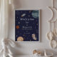 Cute space themed kids birthday welcome poster featuring playful astronaut, planet and star illustrations paired with fun, stylish typography on different color backgrounds. You can find more matching items from this collection in our store.