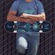 Colorful space alien personalized skateboard, edit the text yourself when ordering.