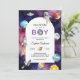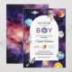 Rymdtemat inbjudan till babyduschpojken med vattenfärgrymd inslag.