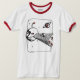 Utforskaren av abstraktens rymd doodlar på en vit t-shirt med röda accenter.