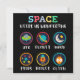 Playful space themed artwork made for curious kids and young students. Cute symbols like UFO, planet, moon, stars, rocket and alien help children explore space science and basic astronomy in a fun and friendly way.