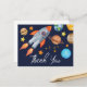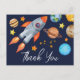 Tvättfärgsfärgrymden var födelsedagskalendern tack för vykortet som kan vara personlig med ditt eget budskap och namn på baksidan. Utformningen har allt utrymme i sak - från fraktaser med raketer till planeter och stjärnor. Detta är ett underbart sätt att tacka alla gäster för deras närvaro och presenter för er lilla födelsedagsfest.