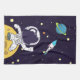 En handduk med mörk blått bakgrund med gultens stjärnor spridda runt. Överst är en illustration av en rymdman som bär en vit astronaut kostym som flyter ovanför måne. Av i avstånd är en planet med ringar och en raketplan som flyger ut i himlar tittar för nya världar att utforska.