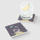 Underlägg med mörk blått bakgrund med gultens stjärnor spridda runt. Överst är en illustration av en rymdman som bär en vit astronaut kostym som flyter ovanför måne. Av i avstånd är en planet med ringar och en raketplan som flyger ut i himlar tittar för nya världar att utforska.