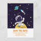 Spara vykortet för datum med en mörk blått bakgrund med gultens stjärnor spridda runt. Överst är en illustration av en rymdman som bär en vit astronaut kostym som flyter ovanför måne. Vavar hej när han utforskar rymden. Av i avstånd är en planet med ringar och en raketfrakt som flyger ut i rymden.