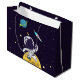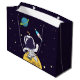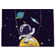 Gåsväska med mörk blått bakgrund med gultens stjärnor spridda runt. Överst är en illustration av en rymdman som bär en vit astronaut kostym som flyter ovanför måne. Av i avstånd är en planet med ringar och en raketplan som flyger ut i himlar tittar för nya världar att utforska.