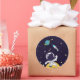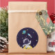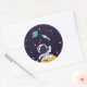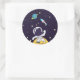 Ett klistermärke med mörk blått bakgrund med gultens stjärnor spridda runt. Överst är en illustration av en rymdman som bär en vit astronaut kostym som flyter ovanför måne. Av i avstånd är en planet med ringar och en raketplan som flyger ut i himlar tittar för nya världar att utforska.