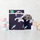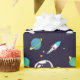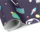 Patternerad papper med mörk blått bakgrund med gultens stjärnor spridda runt. Överst är en illustration av en rymdfarkost med en vit astronaut kostym flytande i rymden. Av i avstånd är planeter med ringar och en frakt med raketer som är utbränd till ställe okänd.